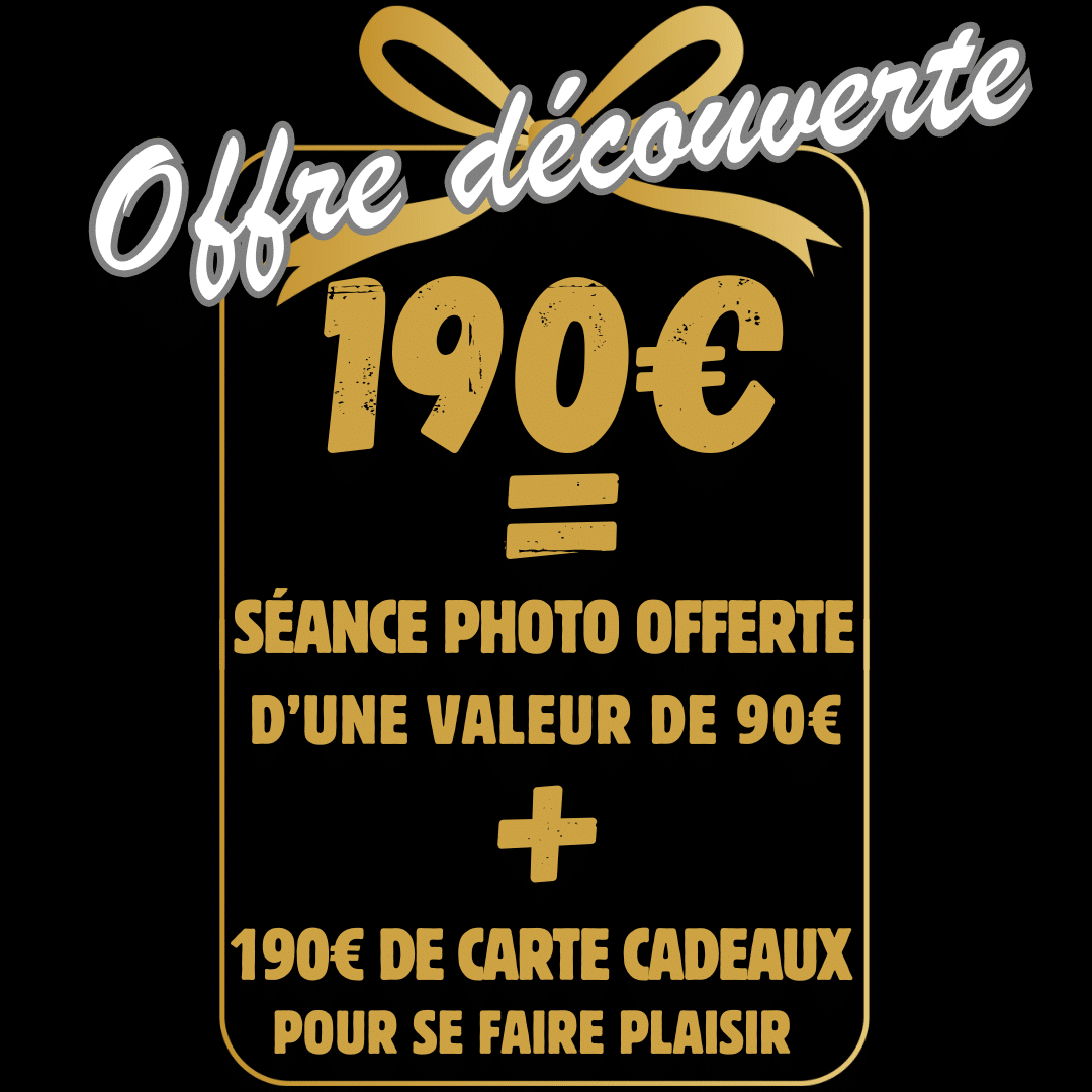 • Une carte cadeau d’une valeur de 190€ à utiliser pendant la séance de découverte des photos. Vous pourrez utiliser cette cagnotte pour l’impression d’autres supports (tous les tarifs sont disponibles sur demande).
