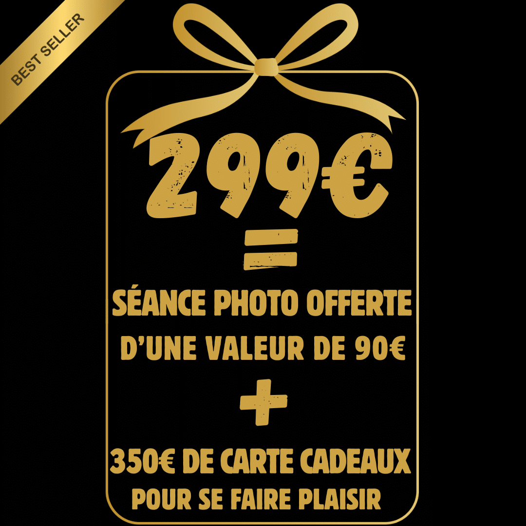 - Une carte cadeau d’une valeur de 350€ à utiliser pendant la séance de découverte des photos. Vous pourrez utiliser cette cagnotte pour l’impression d’autres supports (tous les tarifs sont disponibles sur demande).